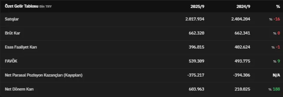 FAVÖK 2025 yılının üçüncü çeyreğinde 539.309.000 TL olarak açıklandı. 2024 yılının üçüncü çeyreğinde 493.775.000 TL olarak açıklanan FAVÖK, 2025 yılının üçüncü çeyreğinde %9 artmış oldu. Net parasal pozisyon kazançları 2025 yılının üçüncü çeyreğinde -375.217.000 TL olarak kaydedildi. Net dönem kârı ise 603.963.000 TL olarak kaydedildi. İlgili veri 2024 yılının üçüncü çeyreğinde 210.025.000 TL olarak açıklanmıştı. Böylece net dönem karı %188 artmış oldu.