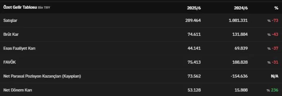 FAVÖK 2025 yılının ikinci çeyreğinde 75.413.000 TL olarak açıklandı. Net parasal pozisyon kazançları 2025 yılının ikinci çeyreğinde 73.562.000 TL olarak kaydedildi. Net dönem kârı ise 53.128.000 TL olarak kaydedildi. İlgili veri 2024 yılının ikinci çeyreğinde 15.808.000 TL olarak açıklanmıştı. Böylece net dönem karı, 2025 yılının ikinci çeyreğinde %236 artmış oldu