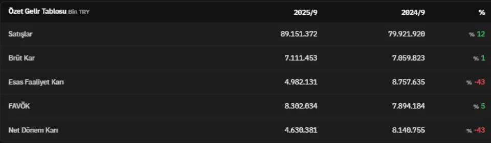 FAVÖK 2025 yılının üçüncü çeyreğinde 8.302.034.000 TL olarak açıklandı. 2024 yılının üçüncü çeyreğinde 7.894.184.000 TL olarak açıklanan FAVÖK, 2025 yılının üçüncü çeyreğinde %5 artmış oldu. Net dönem kârı ise 4.630.381.000 TL olarak kaydedildi. İlgili veri 2024 yılının üçüncü çeyreğinde 8.140.755.000 TL olarak açıklanmıştı.