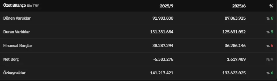 Dönen varlıklar 2025 yılının üçüncü çeyreğinde 91.903.830.000 TL olmuştur. 2025 yılının üçüncü çeyreğinde 131.331.684.000 TL olarak açıklanan duran varlıklar, 2025 yılının ikinci çeyreğinde 125.631.052.000 TL olarak açıklanmıştı. Böylece duran varlıklar %5 artmış oldu. Finansal borçlar 2025 yılının üçüncü çeyreğinde 38.287.294.000 TL olarak kaydedildi.2025 yılının üçüncü çeyreğinde net borç -5.383.276.000 TL olarak açıklandı. Özkaynaklar 2025 yılının üçüncü çeyreğinde 141.217.421.000 TL olarak açıklandı. İlgili veri 2025 yılının ikinci çeyreğinde 133.623.025.000 TL olarak açıklanmıştı. Böylece özkaynaklar, 2025 yılının üçüncü çeyreğinde %6 artmış oldu.