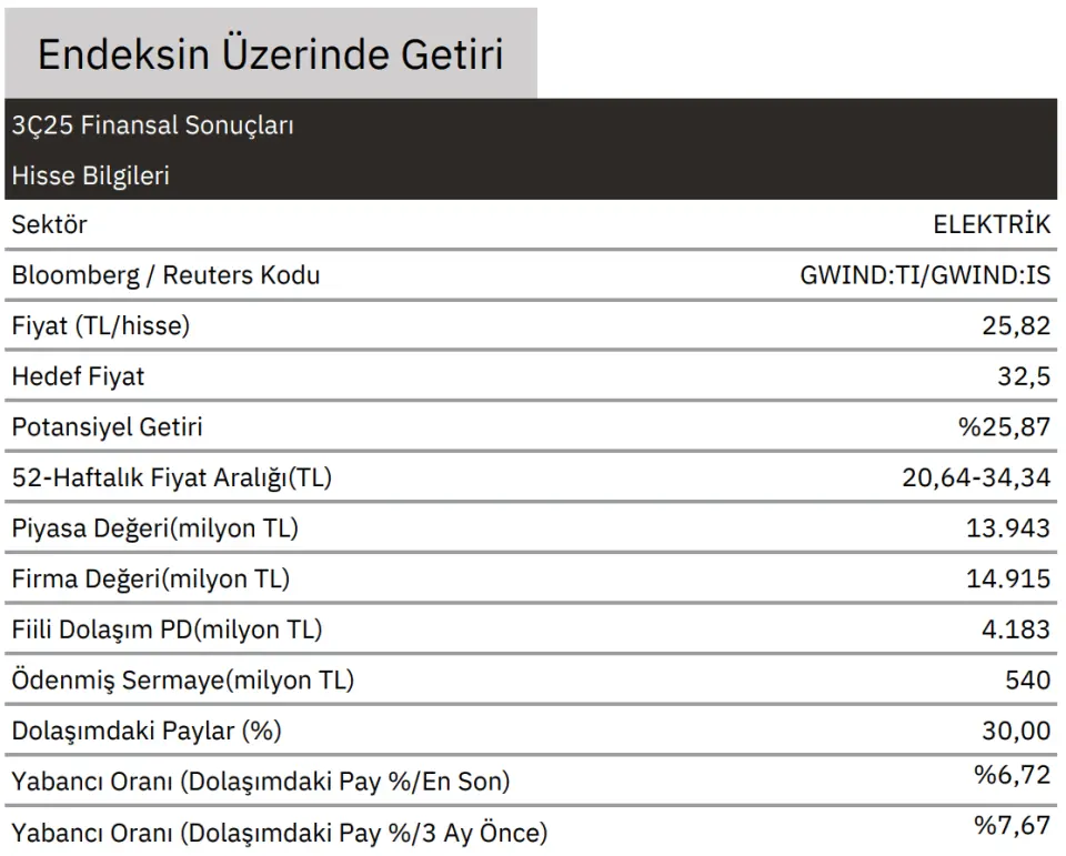 Gedik Yatırım 5 Kasım 2025 tarihinde bir rapor yayınladı. Aracı Kurum yayınladığı raporda enerji şirketinin bilançosuyla ilgili gelişmelere değindi. Galata Wind Enerji şirketi geçtiğimiz günlerde bilançosunu açıklamıştı. Gedik Yatırım ise bu bilanço değerlendirmesiyle birlikte bir de hedef fiyat verdiğini açıkladı. Hedef fiyat doğrultusunda bu potansiyer getiriyi %25 olarak dikkat çekti.