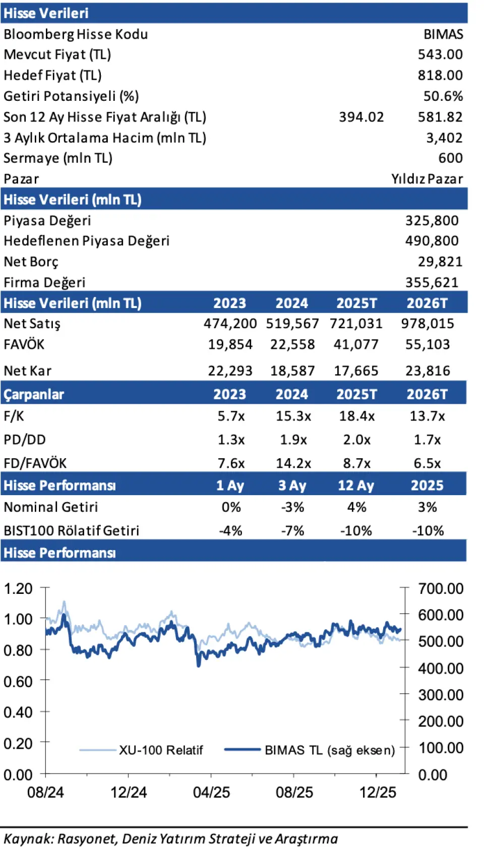 - "BİM Birleşik Mağazaları, 2025 yılında %3 pozitif nominal performans sergilerken, BIST 100 endeksinin %10 gerisinde performans göstermiştir. BIMAS, son 12 aylık verilere göre 20,2x F/K ve 9,3x FD/FAVÖK çarpanları ile işlem görmektedir."