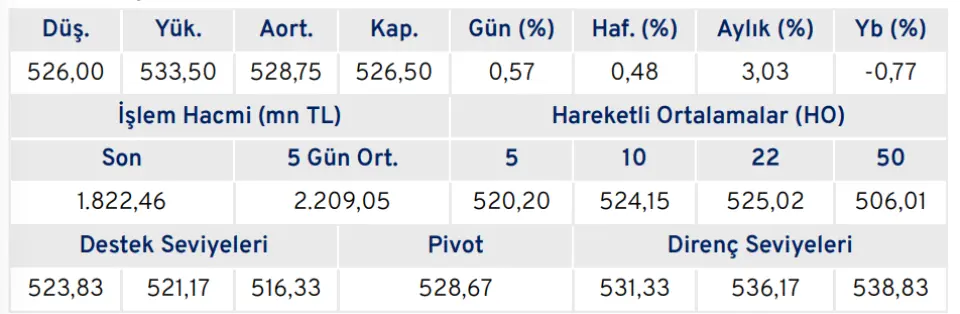 Gün içinde en düşük 526,00 en yüksek 533,50 seviyesini gören Bim Mağazalar hissesinin günü %0,57 kazançla tamamladığı gözlenmektedir. Pivot seviye 528,67 seviyesinden geçmekte olup, aşağı yönlü hareketlerde birinci destek 523,83, ikinci destek ise 521,17 seviyesinden geçmektedir. Dirençler ise sırasıyla 531,33, 536,17 seviyelerinden geçmektedir. Bu aşamada 5 günlük HO seviyesinin %1,21 üzerinde, 22 günlük HO seviyesinin ise %0,28 üzerinde hareket ettiği dikkat çekmektedir. Son gün işlem hacmi ise bu aşamada 5 günlük ortalama işlem hacminin %17,50 altında gerçekleşmiştir.