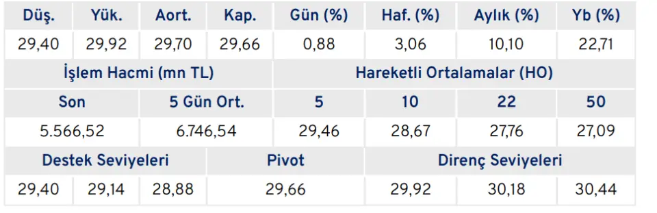 Gün içinde en düşük 29,40 en yüksek 29,92 seviyesini gören Ereğli Demir Çelik hissesinin günü %0,88 kazançla tamamladığı gözlenmektedir. Pivot seviye 29,66 seviyesinden geçmekte olup, aşağı yönlü hareketlerde birinci destek 29,40, ikinci destek ise 29,14 seviyesinden geçmektedir. Dirençler ise sırasıyla 29,92, 30,18 seviyelerinden geçmektedir. Bu aşamada 5 günlük HO seviyesinin %0,69 üzerinde, 22 günlük HO seviyesinin ise %6,83 üzerinde hareket ettiği dikkat çekmektedir. Son gün işlem hacmi ise bu aşamada 5 günlük ortalama işlem hacminin %17,49 altında gerçekleşmiştir.