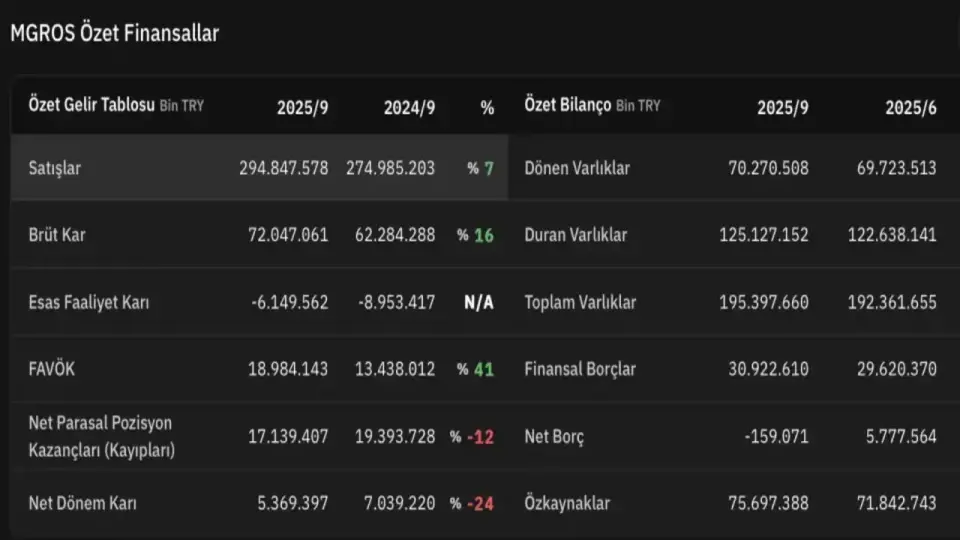 - "2025 yılı üçüncü çeyreğinde Migros Ticaret (MGROS) açıklamış olduğu finansallarda güçlü bir performans gösterdi. Piyasa beklentisinin üzerinde FAVÖK ve net kar elde edildi. Ciroda reel büyümenin devam etmesi ve şirket karlılığı üzerinde baskı yaratan vadeli alım faiz giderinin önceki seneye göre azalış göstermesini olumlu karşılıyoruz. Bu kalemde, yurtiçinde yaşanan Merkez Bankası faiz indirim sürecinin sürmesiyle birlikte olumlu ivmenin devam edeceğini düşünüyoruz."