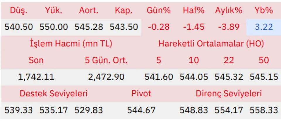 Gün içinde en düşük 540.50 en yüksek 550.00 seviyesini gören BİM Birleşik Mağazalar hissesinin günü %0.28 kayıpla tamamladığı gözlenmektedir. Pivot seviye 544.67 seviyesinden geçmekte olup, aşağı yönlü hareketlerde birinci destek 539.33, ikinci destek ise 535.17 seviyesinden geçmektedir. Dirençler ise sırasıyla 548.83, 554.17 seviyelerinden geçmektedir. Bu aşamada endeksin 5 günlük HO seviyesinin %0.35 üstünde, 22 günlük HO seviyesinin ise %0.33 altında hareket ettiği dikkat çekmektedir. Son gün işlem hacmi ise bu aşamada 5 günlük ortalama işlem hacminin % 29.55 altında gerçekleşmiştir.