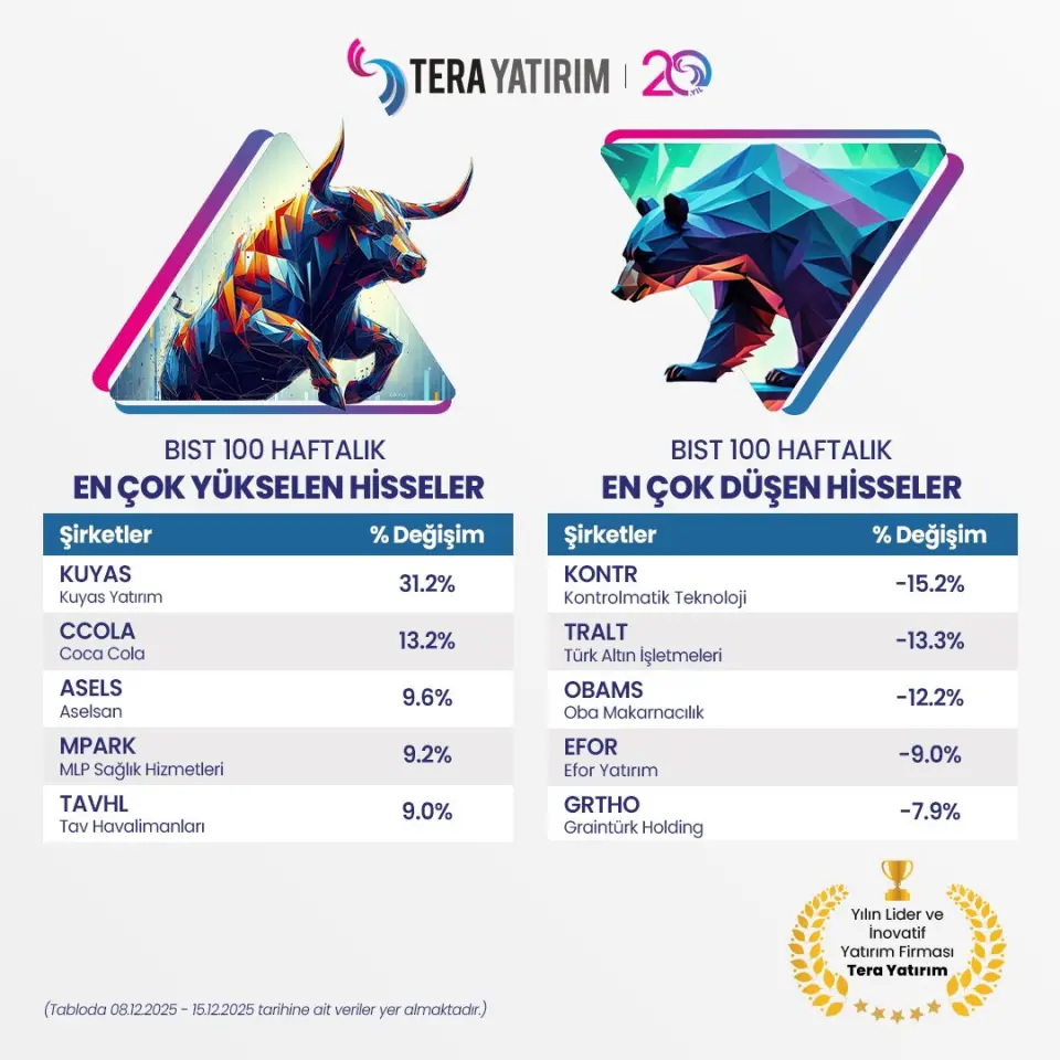 Haftalık olarak Borsa aracı kurumu Tera Yatırım, BIST 100 endeksinde en çok yükselen ve düşen hisseleri açıklıyor. Tera Yatırım, Borsa yatırımcıları için sosyal medya hesabı üzerinden bu hisseleri duyuruyor. Tera Yatırım'ın paylaşımında "BIST 100 Haftalık en çok düşen ve en çok yükselen hisseleri takip ederek yatırım stratejinizi belirleyebilirsiniz." şeklinde bir ifadeye yer verildi.