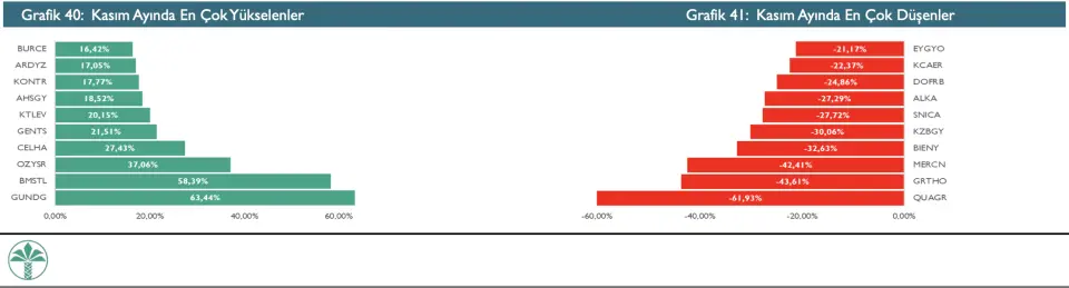 - "Katılım Endeksi hisse bazında; Kasım ayında en çok düşüş %61,93 ile QUAGR hissesinde görülürken, en çok yükseliş %63,44 ile GUNDG hissesinde kaydedildi. Kasım aylarında en yüksek getiri yaklaşık %30,39 ile 2002 yılında gerçekleşirken, en belirgin düşüş %8,17 ile 2008 yılında yaşandı."