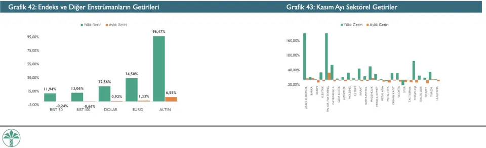 - "Ayın ilk yarısına zayıf görünümle başlayan endekste momentum kaybı dikkat çekerken, ayın ikinci yarısında makroekonomik görünüm ve yurt içi haber akışlarının etkisiyle tepki hareketleri gündeme geldi. İlk etapta güçlü destek bölgesi olarak takip ettiğimiz 10.570 bölgesi korunarak tepki alımları gerçekleşti. Ardından, sırasıyla 10.650 ve 10.750 sıralı direnç bölgeleri geçilerek 11.000 bölgesine ulaşıldı. Ancak, bu bölge üzerinde ilk etapta kalıcılık sağlanamadı. Volatilitenin (oynaklık) yüksek olduğu ayda endeks 10.374 – 11.152 bant aralığında hareket etti. BIST 100 endeksinin istatistiksel olarak Kasım ayı boyunca 8 gün pozitif, 11 gün ise negatif performans sergilediği görülmektedir."