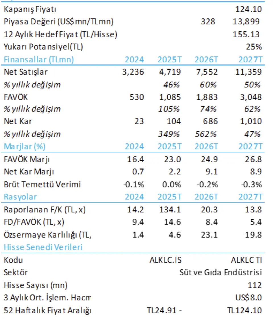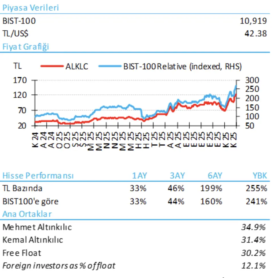- "Yılbaşından beri BIST100’e kıyasla %241 daha iyi performans gösteren ALKLC hisseleri için indirgenmiş nakit akımı (DCF), yurtiçi benzer şirket çarpanları ve yurtdışı benzer şirket çarpanları yöntemleri incelenmiştir. Ancak yurtiçi benzer şirket çarpanları yöntemine göre kıstas alınan şirketlerin ileriye dönük finansallarına dair verilerin yetersiz olması sebebi ile değerlemede indirgenmiş nakit akımları ve yurtdışı benzer şirket çarpanları eşit şekilde ağırlıklandırılmıştır."