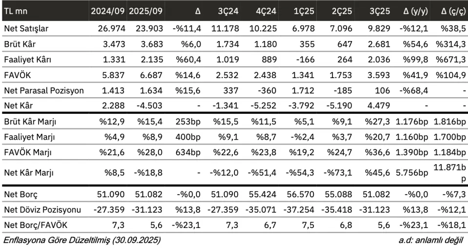 - "3. çeyrekte net satışları önceki senenin aynı çeyreğine oranla %12,06 düşüş ile 9.829 milyon TL olmuştur. 2025'in ilk 9 ayında net satışları %11,38 azalışla 23.903 milyon TL seviyesinde gerçekleşmiştir. FAVÖK‘ü 3. çeyrekte önceki senenin aynı çeyreğine göre %41,91 artışla 3.593 milyon TL olmuştur. 2025'in ilk 9 ayında bir önceki senenin aynı dönemine oranla FAVÖK’ü %14,56 artışla 6.687 milyon TL seviyesinde gerçekleşmiştir."