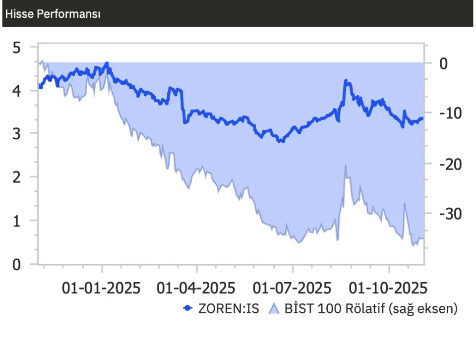 - "İsrail'deki Dorad enerji santralinin %25 hissesinin satışına ilişkin 7,6 milyar TL tutarındaki tek seferlik yatırım geliri, 3Ç25'te negatif gelecek olan net kar rakamının pozitif olmasına sebep olmuştur. Ayrıca, Zorlu Enerji'nin bildirdiği düzeltilmiş FAVÖK, dağıtım segmentinin güçlü karlılığı sayesinde yıllık bazda %23 artışla 4,9 milyar TL'ye yükselmiştir. Net Borç/düzeltilmiş FAVÖK oranı da 2Ç25’teki 3,9x'ten 3Ç25’te 3,4x'e gerilemiştir. Sonuç olarak, sonuçları sınırlı pozitif olarak değerlendiriyor ve son 6 ayda BIST-100 Endeksi’ne göre %17, son 1 yılda ise %43 geride kalan performansından sonra piyasanın ilk tepkisinin olumlu olabileceğini düşünüyoruz. Hisse 2025 yılı tahminlerimize göre 4,2x FD/düzeltilmiş FAVÖK ile işlem görmektedir."