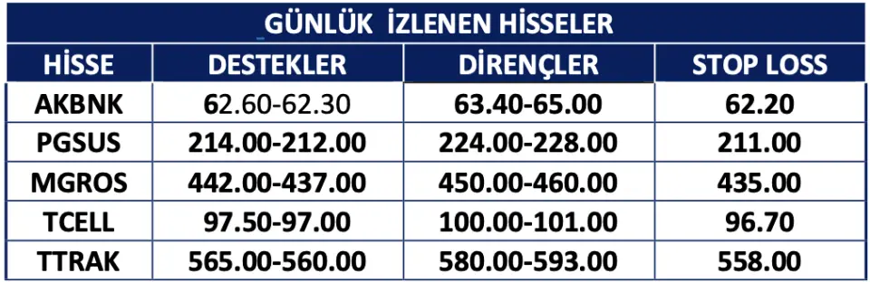 Meksa Yatırım'ın günlük izlenecek hisseler listesinde 5 hisse yer aldı. Destek, direnç ve stop - loss değerleri verilen hisseler dikkat çekti. Bu hisseler; AKBNK, PGSUS, MGROS, TCELL ve TTRAK oldu. Hisseler gün boyunca yatırımcıların odağında olacak. Verilen seviyeleri görüp görmeyeceği merakla bekleniyor.