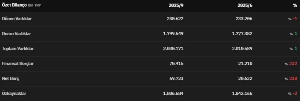Dönen varlıklar 2025 yılının üçüncü çeyreğinde 230.622.000 TL olmuştur. 2025 yılının üçüncü çeyreğinde 1.799.549.000 TL olarak açıklanan duran varlıklar, 2025 yılının ikinci çeyreğinde 1.777.382.000 TL olarak açıklanmıştı. Toplam varlıklar üçüncü çeyrekte 2.030.171.000 TL olarak kaydedildi.