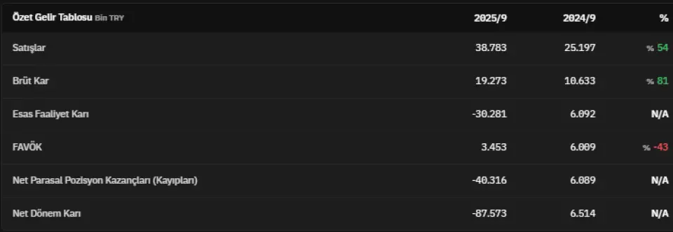 FAVÖK 2025 yılının üçüncü çeyreğinde 3.453.000 TL olarak açıklandı. Net parasal pozisyon kazançları 2025 yılının üçüncü çeyreğinde -40.316.000 TL olarak kaydedildi. Net dönem kârı ise -87.573.000 TL olarak kaydedildi.