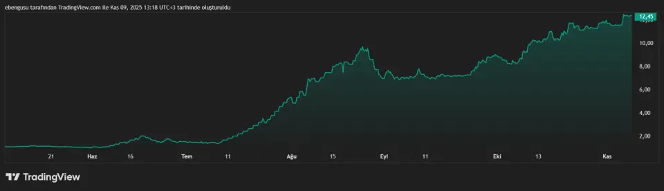7 Nisan 2025 tarihinde 1,16 TL olan PEKGY, 7 Kasım 2025 tarihinde 12,45 TL ile kapanış yaptı. Son 6 ayda %1.030, son 3 ayda ise hissenin fiyatı %79 yükseldi.