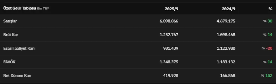 FAVÖK 2025 yılının üçüncü çeyreğinde 1.348.375.000 TL olarak açıklandı. Net dönem kârı ise 419.928.000 TL olarak kaydedildi. İlgili veri 2024 yılının üçüncü çeyreğinde 166.868.000 TL olarak açıklanmıştı. Böylece net dönem karı %152 artmış oldu