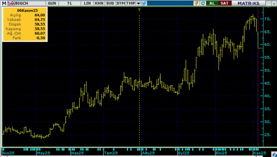 BIGCH bu yıl Mayıs ayında 24 TL civarı fiyattan yükselen trende başladı. Düzenli olarak yükselen hisse, 71,70 TL zirve fiyata kadar primlendi. Bu hafta başından beri satış yiyen hisse bugün 58,55 TL taban oldu. Hissede hızlanan değer kaybına dur demek isteyen şirket gecikmedi ve hemen bir pay geri alım programı kararı aldı.