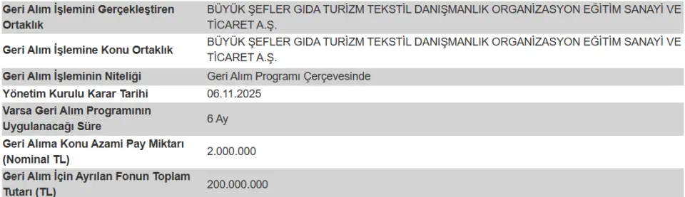 Şirketimiz Yönetim Kurulu'nun 06.11.2025 tarihli toplantısında, 6102 sayılı Türk Ticaret Kanunu, 6362 sayılı Sermaye Piyasası Kanunu ve Sermaye Piyasası Kurulu'nun II-22.1 sayılı "Geri Alınan Paylar Tebliği" nde yer alan düzenlemeler ile ilgili ilke kararları dikkate alınarak hazırlanan ve Şirketimiz paylarının piyasadaki sağlıklı ve istikrarlı fiyat oluşumuna katkıda bulunulmasını amaçlayan ekli "Pay Geri Alım Programı"nın yapılacak ilk genel kurul toplantısında pay sahiplerinin onayına sunulmasına oybirliğiyle karar verilmiştir.
