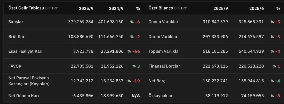 - "Brüt marj ç/ç 0,67 y.p. genişlerken, Operasyonel giderler/satışlar ç/ç 0,16 y.p. geriledi. Yönetim girdilerdeki seyrin 4. çeyrekte de sınırlı da olsa devam edeceği bekliyor. Yapısal dönüşümde güncel durum: Planlanan 2 bin işten çıkarmanın ~%90’ında (~1.800 bin pozisyon) uzlaşma sağlandı; Birleşik Krallık ve Polonya tesisleri kapandı, üretim Türkiye’ye taşındı; İtalya’daki bir tesis 2025’te kapanacak. İşten çıkarmalara ilişkin karşılıklar 2024’te (3Ç25 itibarıyla bilançodaki karşılık ~7,2 milyar TL) ayrıldığı için ilave bir gider etkisi görmemeyi; ancak nakit çıkışı olarak karşımıza çıkmasını bekliyoruz. Borçluluk geriledi ancak hala yüksek. Toparlanan FAVÖK, işletme sermayesinde tahsilatlarla desteklenen gerileme ve sınırlı yatırım harcaması (satışların ~%2,4’ü; y/y -2,34 y.p., ç/ç -0,54 y.p.) ile 3Ç25’te 13,3 milyar TL pozitif SNA üretildi; yılbaşından beri SNA -12,6 milyar TL’ye toparlamış oldu."