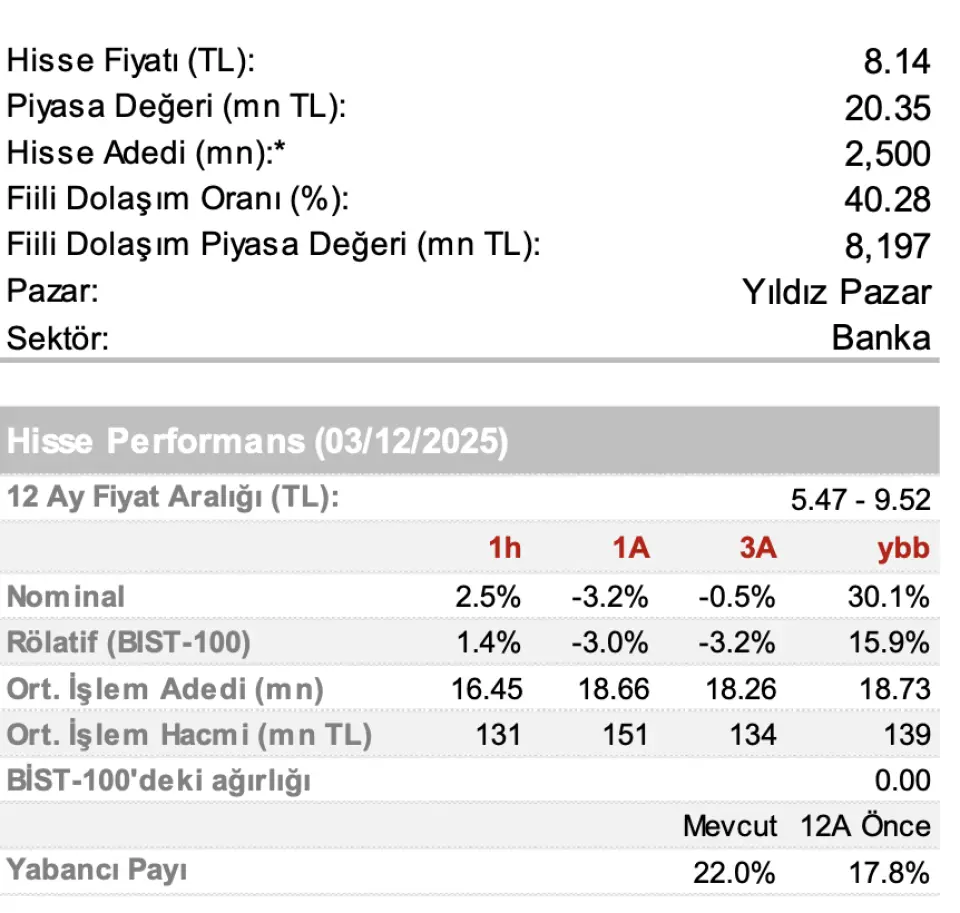 - "2025'in üçüncü çeyreğinde piyasa beklentisine paralel net karlılık açıklayan Banka’nın çeyreklik net karı 701 milyon TL oldu. Banka, 2025 yılının ilk çeyreğinde güçlü temel bankacılık gelirlerine ek olarak iptal ettiği 7mlr TL tutarındaki serbest karşılığın da etkisiyle 7,8mlr TL net kar açıkladı. İkinci çeyrekte net faiz gelirlerindeki hafif daralmaya rağmen güçlü net trading geliri ve görece azalan faaliyet gideri sebebiyle 1,3mlr TL net kar elde etti."