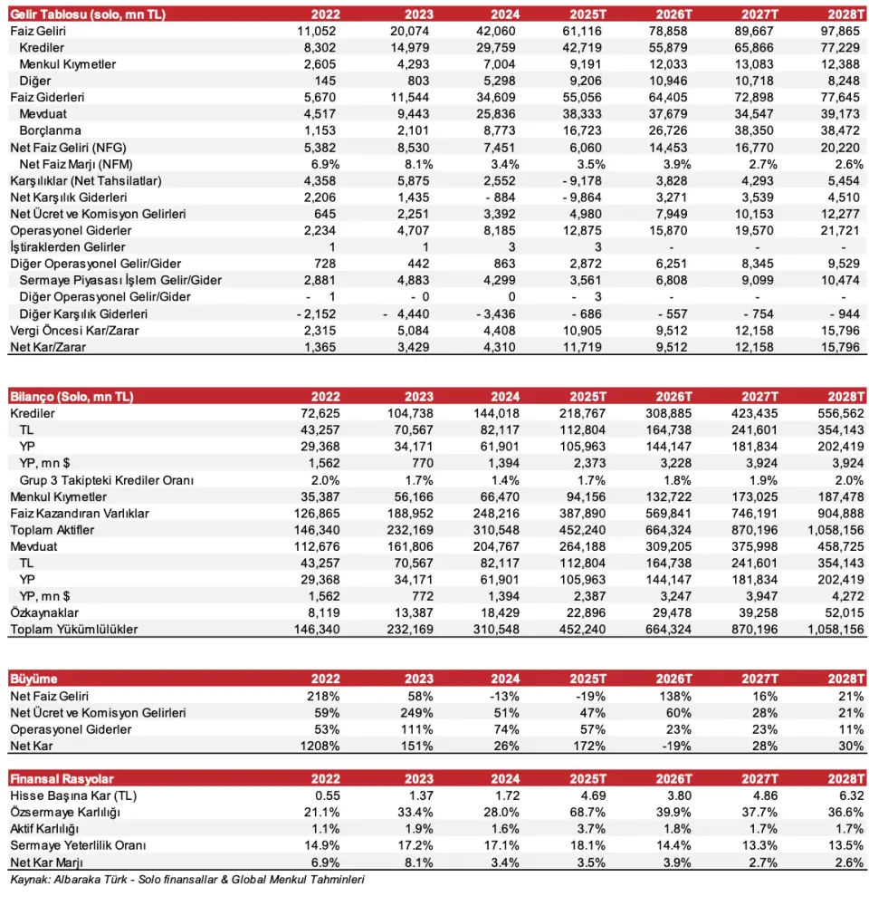 - "Banka’nın Şubat 2025’te açıkladığı ilk beklentilerinde toplam kredi büyümesinde yıllık bazda artışın %35 olması, tahsili gecikmiş alacaklar oranının %2’nin altında olması ve karşılık oranının %85 seviyesinde olması, swap dahil net faiz marjının %2,5 civarında seyretmesi ve özkaynak karlılığının %25-30 aralığında bulunması bekleniyordu."