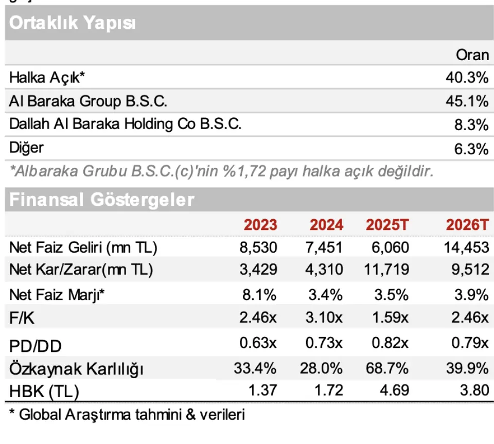 - "Albaraka Türk Katılım Bankası’nı vadesiz mevduat payının muadillerine göre oldukça güçlü olması, iyileşen aktif kalitesi, güçlenen sermaye yapısı ve varlık temelli büyüme modeline öncülük eden konumu sebebiyle temel olarak beğeniyoruz. Banka’nın dijitalleşme yatırımları, faizsiz finans talebinin artışı, güçlü bilanço esnekliği sağlayan ağırlıklı olarak gayrimenkule dayalı varlıkları ve 2025 makro politikalarının sağladığı TL fonlama, kar paylaşımı ve kredi fırsatları ile desteklenen bir büyüme hikayesi sunduğuna inanıyoruz."