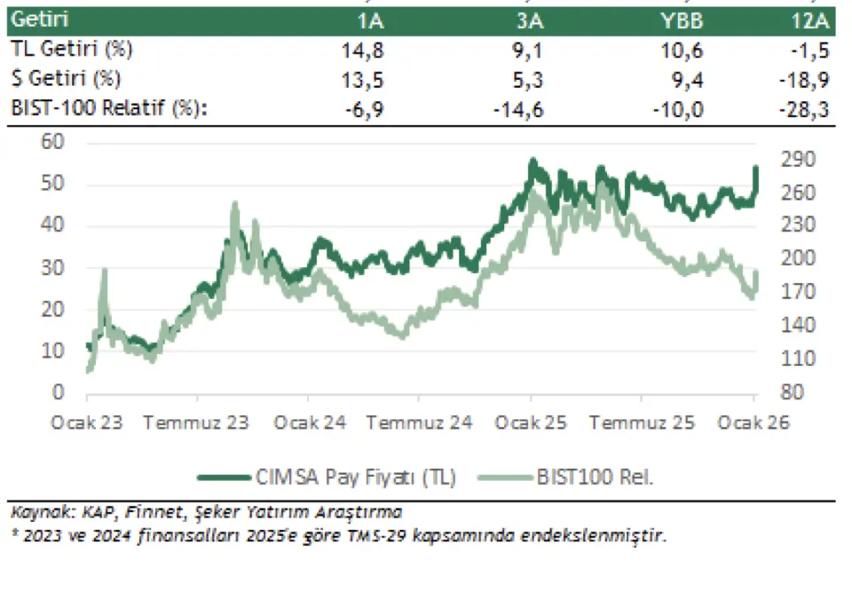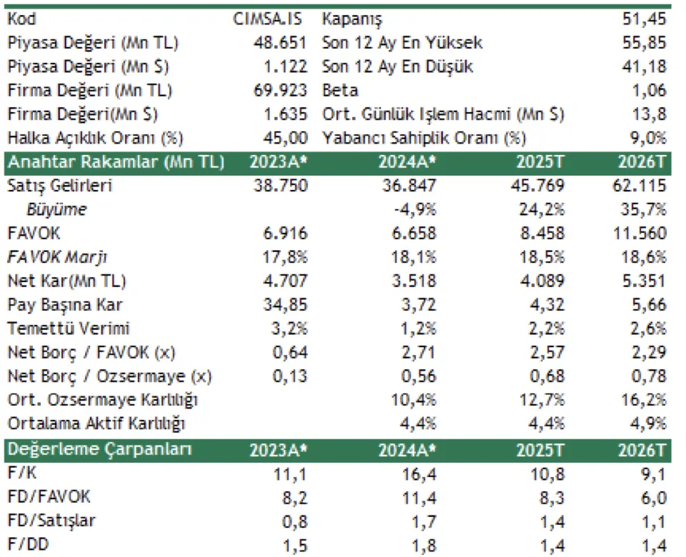 - "Çimsa’nın 2025 yılında 45.769mn TL satış geliri, 8.458mn TL FAVÖK ve 4.089mn TL net kar elde etmesini bekliyoruz. 2026 yılı içinse 62.115mn TL satış geliri, 11.560mn TL FAVÖK ve 5.351mn TL net kar beklentimiz bulunuyor."