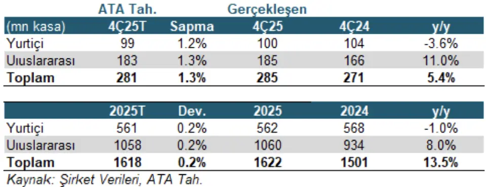 Ata Yatırım Analist Yorumu:" 4Ç25T'de Ata Yatırım olarak Türkiye operayonlarında yıllık bazda %5.0 hacim büyümesi ve uluslarası operasyonlarda yıllık bazda %10 hacim artışı tahmin ediyorduk. 4Ç25'te 281mn kasa satış hacmi beklentiminiz gerçekleşen 285mn kasa satış hacminin 1.3% altındadır. 2025T'de şirket öngörüsü olan konsolide orta-tek haneli hacim büyümesine paralel %6.0 hacim artışı bekliyoruz. 4Ç25'te beklentilerin hafif üzerinde gerçekleşen hacim verilerini dikkate alındığında hafif olumlu olarak değerlendiriyoruz. Tahmin ve değerlemelerimiz en yakın zamanda güncelleyeceğiz."