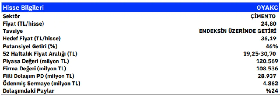 Gedik Yatırım OYAKC hissesine 36,19 TL hedef fiyat tespit etti. Hisseden beklenen kazanç %46 oranında. OYAKC borsada 23 TL civarı fiyatlardan işlem görüyor.