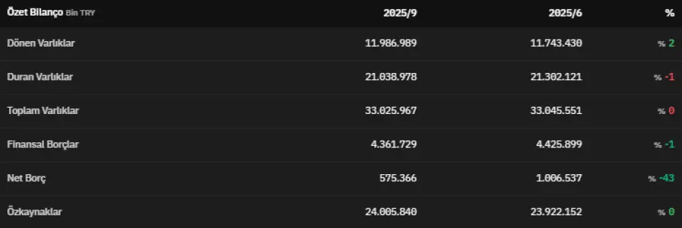 Dönen varlıklar 2025 yılının üçüncü çeyreğinde 11.986.989.000 TL olmuştur. 2025 yılının üçüncü çeyreğinde 21.038.978.000 TL olarak açıklanan duran varlıklar, 2025 yılının ikinci çeyreğinde 21.302.121.000 TL olarak açıklanmıştı. Toplam varlıklar üçüncü çeyrekte 33.025.967.000 TL olarak kaydedildi.