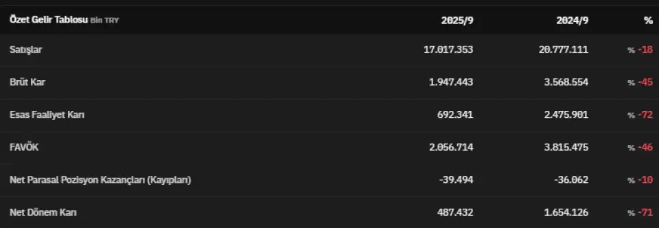 FAVÖK 2025 yılının üçüncü çeyreğinde 2.056.714.000 TL olarak açıklandı. Net parasal pozisyon kazançları 2025 yılının üçüncü çeyreğinde -39.494.000 TL olarak kaydedildi. Net dönem kârı ise 487.432.000 TL olarak kaydedildi.
