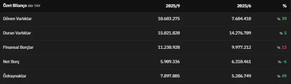 Dönen varlıklar 2025 yılının üçüncü çeyreğinde 10.603.275.000 TL olmuştur. 2025 yılının üçüncü çeyreğinde 15.021.820.000 TL olarak açıklanan duran varlıklar, 2025 yılının ikinci çeyreğinde 14.276.709.000 TL olarak açıklanmıştı. Finansal borçlar 2025 yılının üçüncü çeyreğinde 11.238.928.000 TL olarak kaydedildi.2025 yılının üçüncü çeyreğinde net borç 5.909.336.000 TL olarak açıklandı. Özkaynaklar 2025 yılının üçüncü çeyreğinde 7.897.805.000 TL olarak açıklandı. İlgili veri 2025 yılının ikinci çeyreğinde 5.286.749.000 TL olarak açıklanmıştı. Böylece özkaynaklar %49 artmış oldu.