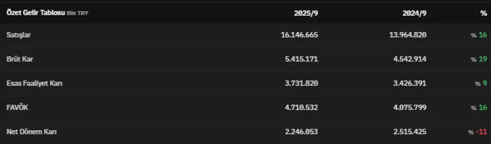 FAVÖK 2025 yılının üçüncü çeyreğinde 4.710.532.000 TL olarak açıklandı. Net dönem kârı ise 2.246.053.000 TL olarak kaydedildi.