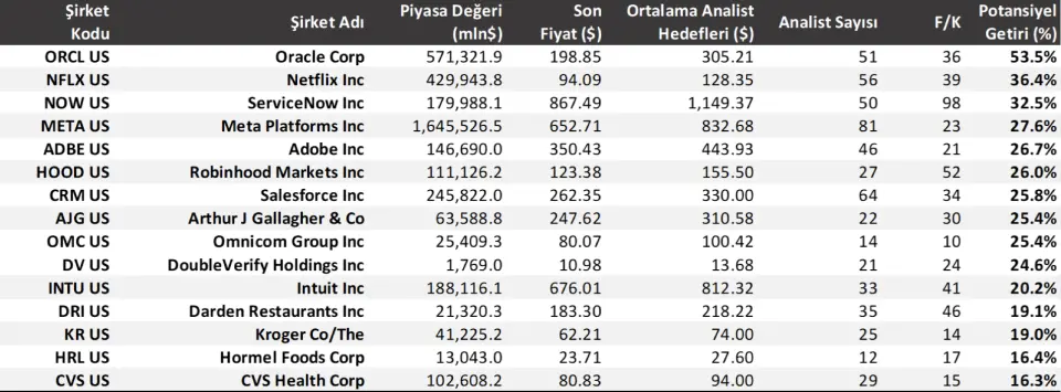 Güncel değerleme / analiz raporları yayımlanan ve bu raporlarda‘’alım’’ önerileri ile dikkat çeken S&P 500 şirketlerini aşağıda görebilirsiniz. Tablodaki veriler, Tacirler Yatırım beklentilerini değil, Bloomberg’de paylaşılan güncel analist beklentilerini yansıtmaktadır.