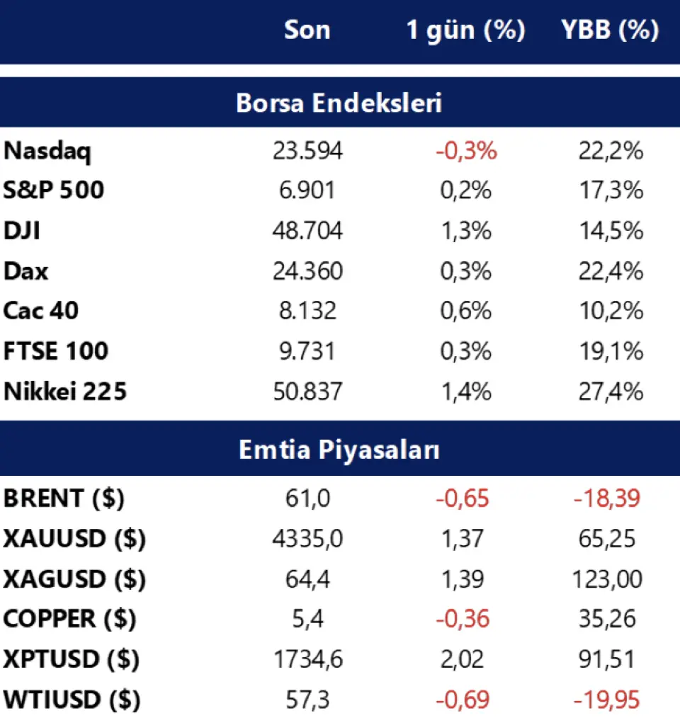 Jeopolitik tarafta, Trump–Modi temasları, yüksek tarifeler sonrası ABD–Hindistan hattında kademeli bir normalleşme ihtimalini güçlendirirken, kritik teknoloji ve savunma iş birliklerinin genişleyebileceğine yönelik mesajlar küresel tedarik zincirleri açısından önem taşıyor. Rusya–Ukrayna cephesinde ise Washington’un “eylem beklentisi” vurgusu ve hafta sonu planlanan görüşmelere yönelik temkinli yaklaşımı, diplomasinin hızlanabileceğine dair beklentileri sınırlı da olsa gündemde tutuyor.