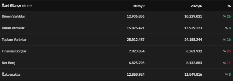 2025 yılının üçüncü çeyreğinde net borç 6.825.793.000 TL olarak açıklandı. Özkaynaklar 2025 yılının üçüncü çeyreğinde 12.850.924.000 TL olarak açıklandı. İlgili veri 2025 yılının ikinci çeyreğinde 11.849.816.000 TL olarak açıklanmıştı. Böylece özkaynaklar %8 artmış oldu.