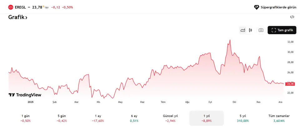 Ereğli, son 1 ay içinde de %18 civarında değer kaybetti. Bu düşüş, hissedeki zayıf görünümü daha belirgin hale getirdi. Şirketin geçmiş dönemdeki güçlü trendlerine ne zaman geri dönebileceği ise belirsizliğini koruyor.