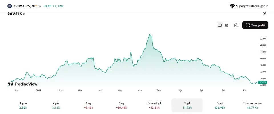 Şirketin 6 aylık performansına bakıldığında tablo daha da netleşiyor: Kardemir son 6 ayda %30’a yakın değer kaybetti. Bu da hissede ciddi bir dalgalanma ve belirsizlik olduğunu gösteriyor.