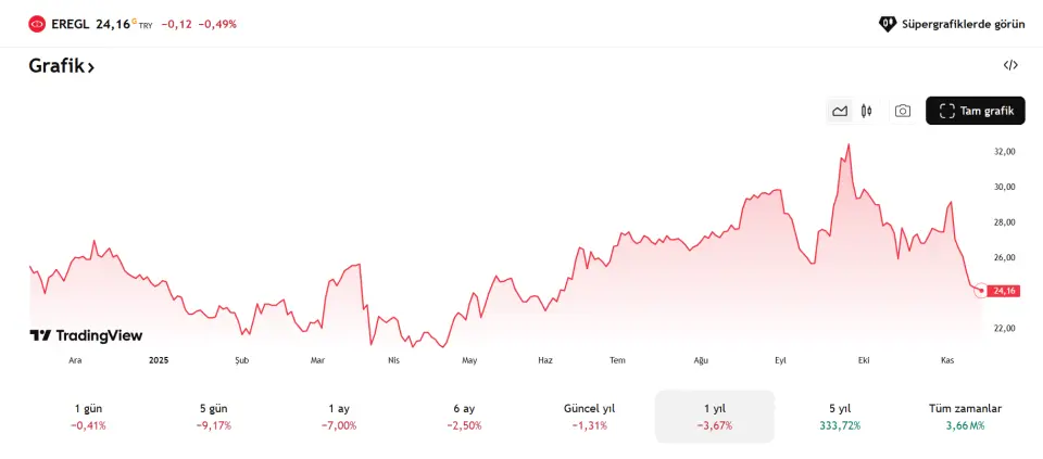 Şirketin 1 yıllık performansına bakıldığında tablo pek iç açıcı değil. Ereğli son 1 yılda yatırımcısına yaklaşık %3 kayıp yazdırmış durumda. Bu da özellikle bankaların %50’lere dayanan faiz oranlarını düşündüğümüzde, yatırımcı açısından tatmin edici olmaktan çok uzak. Yatırımcılar daha yüksek getiri beklerken, hisse neredeyse yerinde saymaya devam etti.