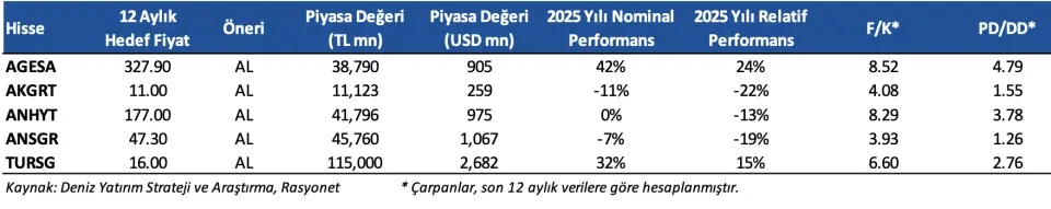 - "Diğer yandan, bireysel kredi büyümesindeki normalleşme beklentimiz, krediye bağlı hayat sigortası prim üretimini 2025'e kıyasla ivmelendirecektir. Bu katalizörler ışığında AGESA ve ANHYT, 2026 projeksiyonlarımızda öne çıkan şirketler olarak yer almaktadır."