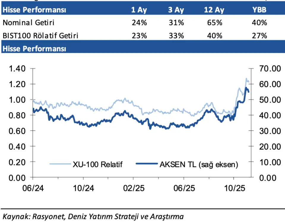 - "2025 tahminlerimize göre AKSEN hissesi 10,1x, 2026 tahminlerimize göre ise 5,8x FD/FAVÖK çarpanıyla işlem görmektedir. Hisse, yıl başından itibaren BIST 100 endeksinin %27 üzerinde performans göstermiştir. Geriye dönük 12 aylık verilere göre hisse 36,2x F/K ve 9,6x FD/FAVÖK çarpanlarından işlem görmektedir."