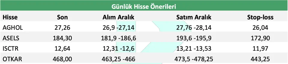 Aracı kurum "Endeksin yükselişinde banka ve holdinglerin daha ön planda olmasını bekliyoruz. Holding ve bankacılık sektöründe geride kaldığını düşündüğümüz Anadolu Grubu Holding ve İş Bankası’nı günlük önerilere eklerken, Türkiye’nin savunma sanayine yönelik ambargoların kalkmasıyla birlikte Aselsan başta olmak üzere Otokar’ın yeni ihracat siparişlerine olumlu katkı yapmasını bekliyoruz." ifadesini kullandı.