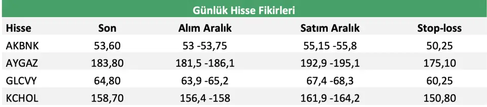 Destek Yatırım günlük hisse fikirleri listesinde; AKBNK, AYGAZ, GLCVY ve KCHOL'e yer verdi. Aracı kurum, hisseleri seçme sebeplerini paylaştı. Kurum, "Enerji Yatırımları A.Ş.’den temettü ve arsa satışı kaynaklı gelirlerle nakit pozisyonunu önemli ölçüde güçlendirecek olan Aygaz’ı, dolar bazında dip seviyelere gerileyen ve Net Aktif Değeri’ne göre %40’ı aşan iskonto ile işlem gören Koç Holding’i, yıl sonuna doğru alacak portföyünü artırmasını beklediğimiz Gelecek Varlık Yönetimi’ni ve bankacılık sektörünün kâr beklentileriyle birlikte tepki vermesini beklediğimiz Akbank’ı günlük fikirlere ekliyoruz." ifadesini kullandı.