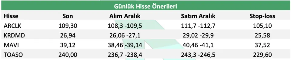 Destek Yatırım'ın günlük hisse önerileri listesinde ARCLK, KRDMD, MAVI ve TOASO yer aldı. Aracı kurum, "Euro/Dolar paritesindeki yükselişin ihracatçı kesime olumlu etkisini Arçelik ve Tofaş Oto özelinde, Çin’in demir–çelik ihracatına lisans zorunluluğu getirmesinin küresel çelik fiyatlarına destekleyici etkisini ise Kardemir Çelik özelinde değerlendiriyoruz. Ayrıca beklentilerin üzerinde açıklanan finansallarıyla Mavi Giyim’i de günlük önerilerimiz arasında yer veriyoruz." ifadelerini kullandı.