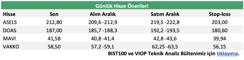 Destek Yatırım'ın hisse önerileri listesinde ASELS, DOAS, MAVI ve VAKKO yer aldı. Aracı kurum, "Güçlü operasyonel kârlılığını piyasa fiyatlamasına yansıtmayı başaran Mavi Giyim, satışlarını ağırlıklı olarak yıl sonunda gerçekleştiren Vakko Tekstil’i, yeni savunma sanayi siparişlerinin yanı sıra Suriye’de artan jeopolitik risklerin de desteklediği Aselsan’ı ve dünkü geri çekilmede yatay destek seviyesine gerileyen Doğuş Otomotiv’i günlük hisse önerilerimizde yer veriyoruz." ifadesini kullandı.