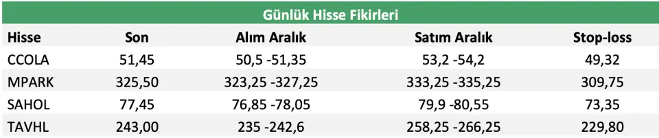 Aracı kurum, "Ulaştırma sektöründe rekabetten daha az etkilenen ve yolcu büyüme etkisini sezonluk gösterebilecek olan Tav Havalimanları, yurtdışı operasyonlarının katkısı ile yeniden reel büyümeye dönecek olan Coca-Cola, Koç Holding’e göre tepkisi sınırlı kalan Sabancı Holding’i ve defansif sağlık sektörünün agresif büyüyen temsilcisi Medikal Park’ı bugün günlük hisse fikirlerinde yer veriyoruz." ifadesini kullandı.