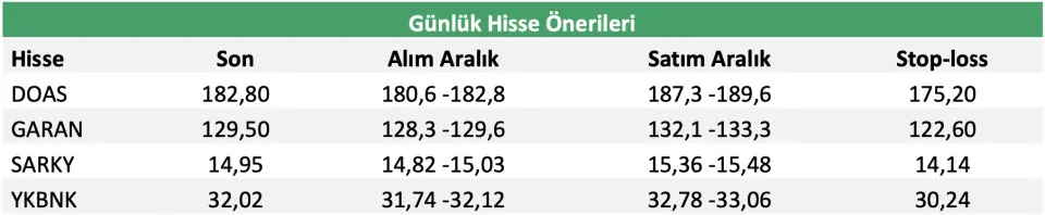 - "Bankacılık sektöründe sert düşüş sonrasında meydana gelen dengelenmenin bir tepki getirmesi öngörüsü ile Garanti Bankası (GARAN) ve Yapı Kredi Bankası’nı (YKBNK), benzer metal şirketlerine oranla reel büyüme ve marj artışı yakalayan Sarkuysan’ı (SARKY) ve son olarak iyi gelen finansallarının zorlu piyasa koşulları sebebi ile hisse fiyatına tam yansımadığını düşündüğümüz Doğuş Otomotiv’i (DOAS) günlük önerilerimize ekliyoruz."