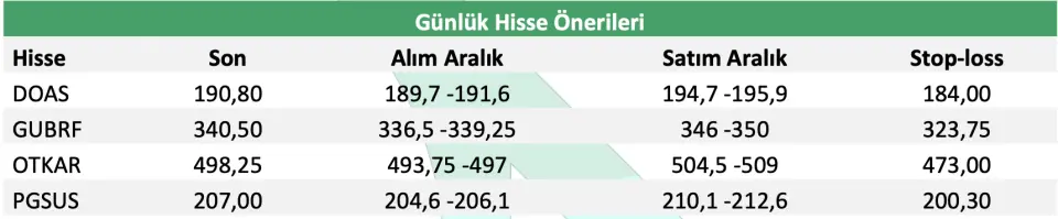 Destek Yatırım günlük hisse önerileri listesinde DOAS, GUBRF, OTKAR ve PGSUS'u paylaştı. Bu hisselere ait alım - satım aralıkları ve stop- loss değerleri verildi. Aracı kurum, "Euro bazında stok ve satışlarını gerçekleştiren Doğuş Otomotiv’i, finansallarını Euro bazında açıklayan Pegasus’u, Euro bazında iş yükü olan ve yılın son çeyreğinde araç teslimleri gerçekleşecek Otokar ile rekor seviyelere yükselen altın üretimi yapan Gübre Fabrikaları’nı günlük hisse önerilerinde yer veriyoruz." ifadesini kullandı.