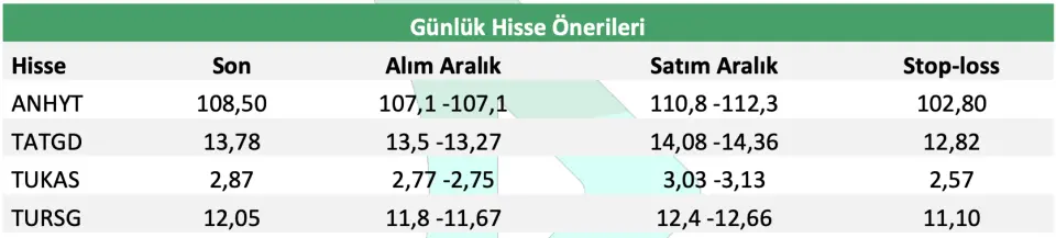 Destek Yatırım'ın hisse önerileri arasında ANHYT, TATGD, TUKAS ve TURSG yer aldı. Aracı kurum, "Ocak ayında gıda fiyatlarında yaşanan yükseliş ve şubat ayında Ramazan etkisini göz önüne alarak Tukaş Konserve ve Tat Gıda’yı, kısa vadeli faiz oranlarının yüksek seyretmeye devam edeceği beklentisinin sigorta şirketlerinin finansal yatırım gelirlerine olumlu yansıması nedeniyle ise Anadolu Hayat ve Türkiye Sigorta’yı günlük hisse önerilerimize ekliyoruz." ifadelerini kullandı.